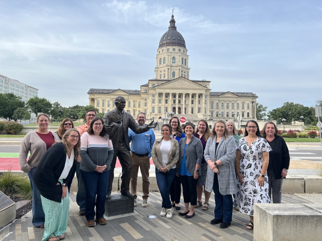 Photo Caption: Attendees pose for photo with statue of Dr. Samuel Crumbine and the state capitol in the background: Front Row (L-R): Brittany Overmiller (Smith County), Monique Eaton (Thomas County), Candice Sauers (Saline County), Kendra Baldridge (KDHE), Misty Trudeau (Barton County), Sonja Armbruster (WSU CEI) Back Row (L-R): Candace Davidson (Reno County), Wanda Agnew (Jefferson County), Jason Tiller (Saline County), Seth Bate (WSU CEI), Alison Koonce (Lawrence Memorial Hospital), Tracy Hall (Butler County), Arlene Doll (Lane County), Tina Payne (WSU CEI)